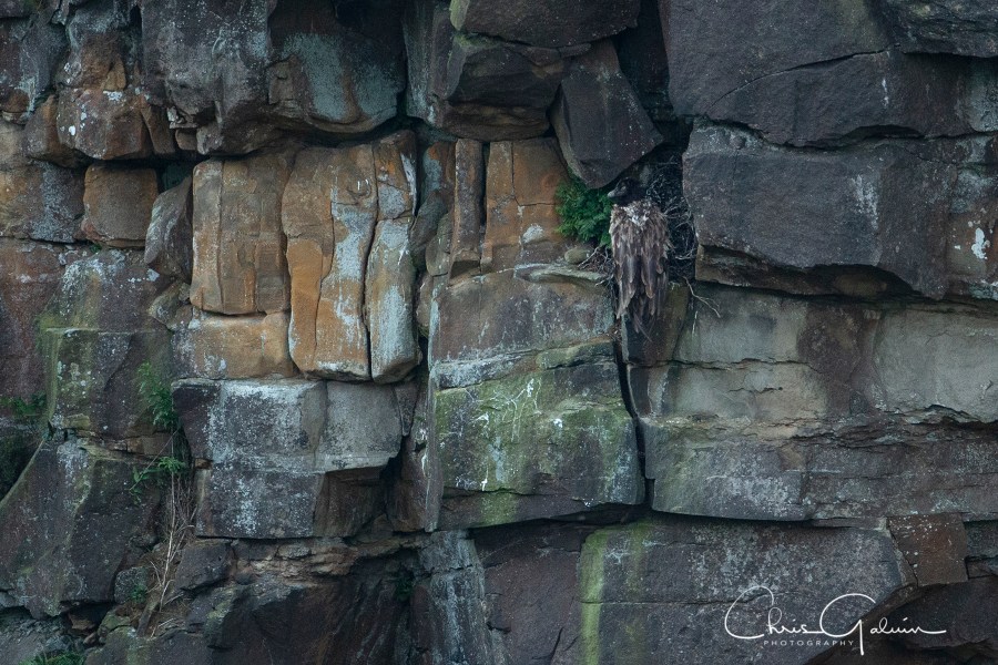 With silhouette images in the can, I settled in for looking for the the Lammergeier. The light was still poor so I got out the MM4 77 ED. We found the bird on the third crag in from the right hand side of Crook Clough and was about 15 feet up and facing left.
