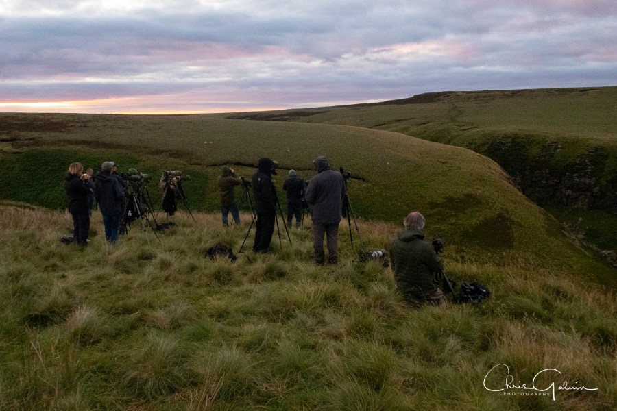At daybreak I sat down to to get some images of silhouetted birders against the light and was subjected to a vicious attack of midges and still suffer from the lumps & bumps on my neck and around my ears. Opposite from our watchpoint we could see birders above the cliffs where the bird had roosted and with torches were looking for the bird. Some of us shouted over to the them that they were likely to disturb the bird. The torches were turned off and they walked around to where we were watching and joined us.