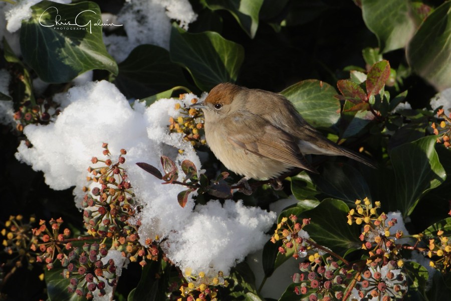 Female Blackcap in my garden after snowfall 19th December 2010. This was a year when I had up to 4 wintering Blackcap in my garden feeding on Pyracantha berries. Taken with Canon 7D + EF 500/4
