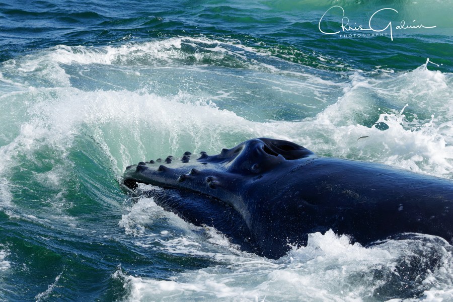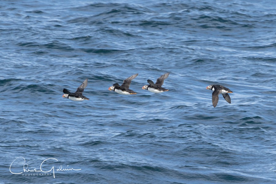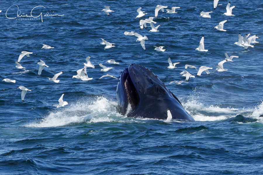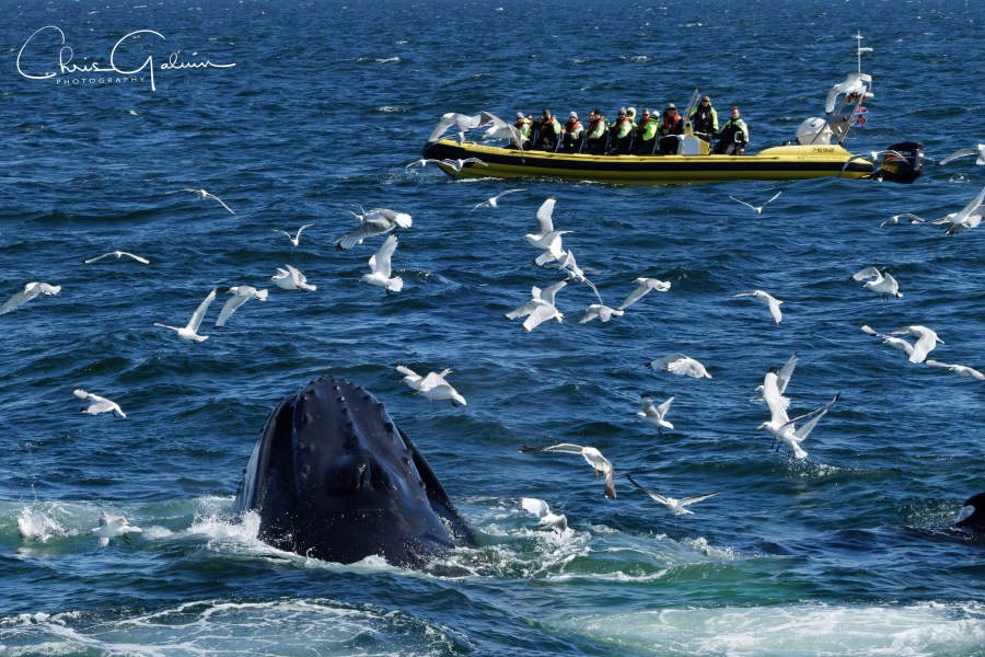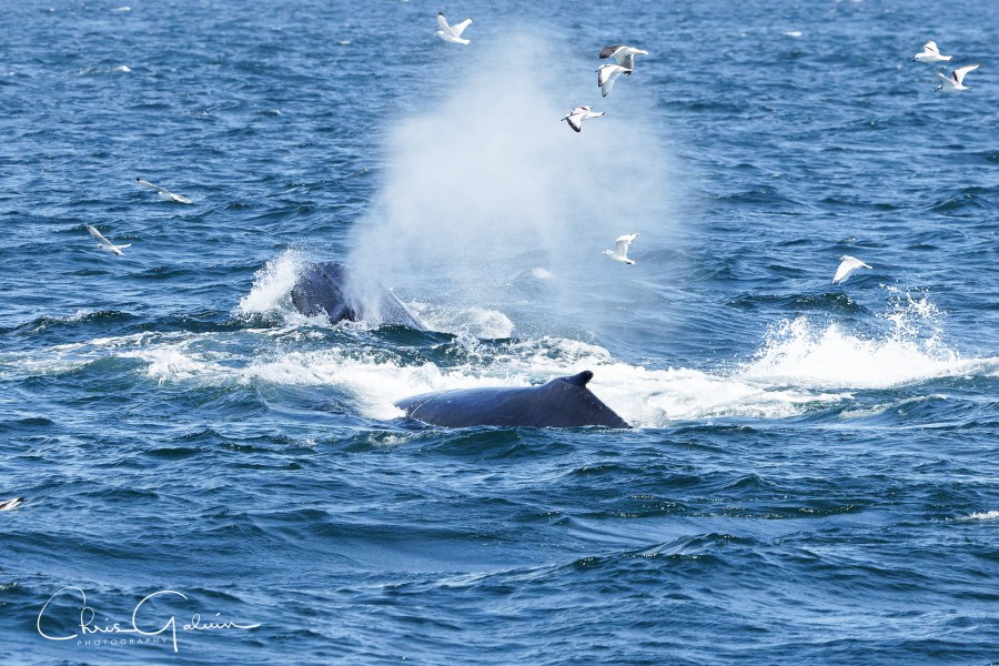 Once onboard I staked out a place that I wanted to bird from, keeping a watching eye on the birds would locate where the whales were feeding. As we headed out into the bay, we watched the passengers on the rib get soaked as waves crashed over the gunwhales, Northern Fulmar on stiff wings were soon in the wake and Atlantic Puffin with rapid wing beats were popular with the Americans. It took about 20 minutes to reach the nutrient rich feeding grounds in the outer bay where the water was deeper. It was here where we found the first of three Fin Whales. None of the dramatic feeding and lunging that we would experience later with the Humpbacks, just the odd dorsal fin as they swam close to the boat. We found the first Humpbacks by watching where the Gulls, Kittiwakes, Gannets, Puffins & Fulmars were. The Humpbacks have a feeding technique that involves them working together as a team. They take a deep dive and surround a shoal of fish with bubbles and swim around them forcing them to the surface when they lunge upwards open-mouthed scooping up thousands of fish. Once the first Humpback appeared anyone who had a place at the rail was surrounded by by tourists with iPhones taking video and images, I’m amazed that I didn’t see a phone plunge overboard. We watched a family party of Humpbacks for what must have been an hour and other boats headed over to our location to watch the spectacle, including the ribs who got very close, perhaps too close to the whales.